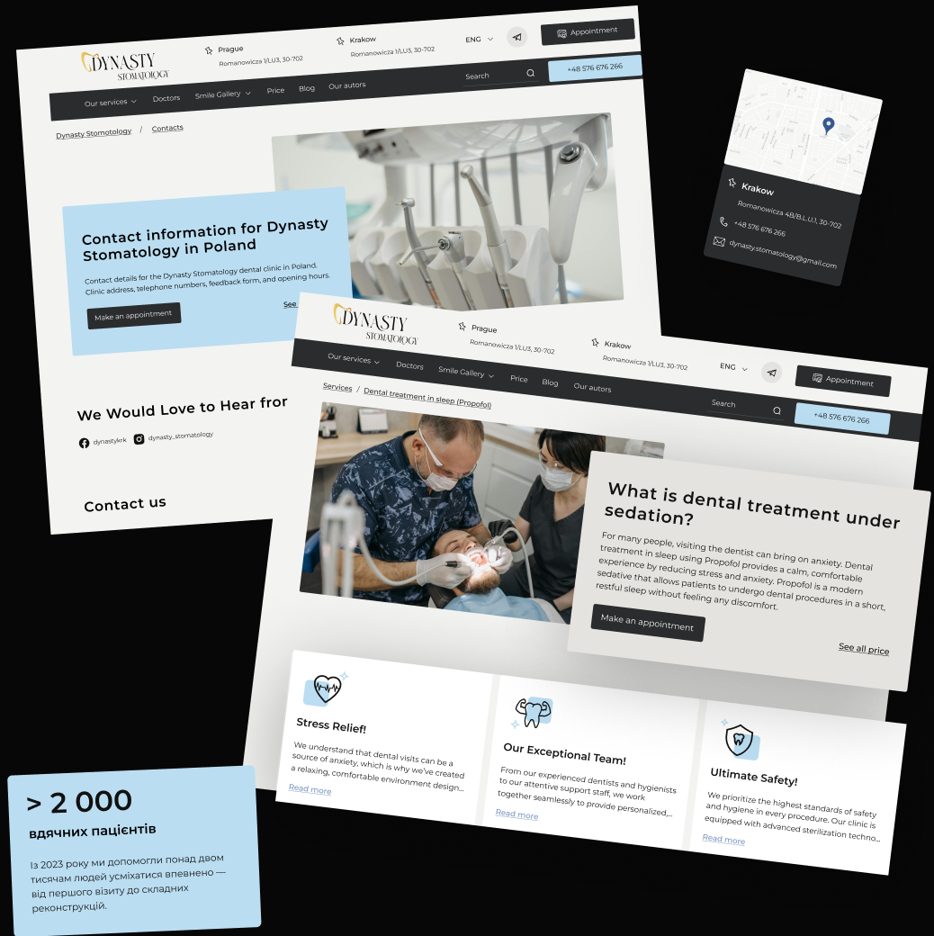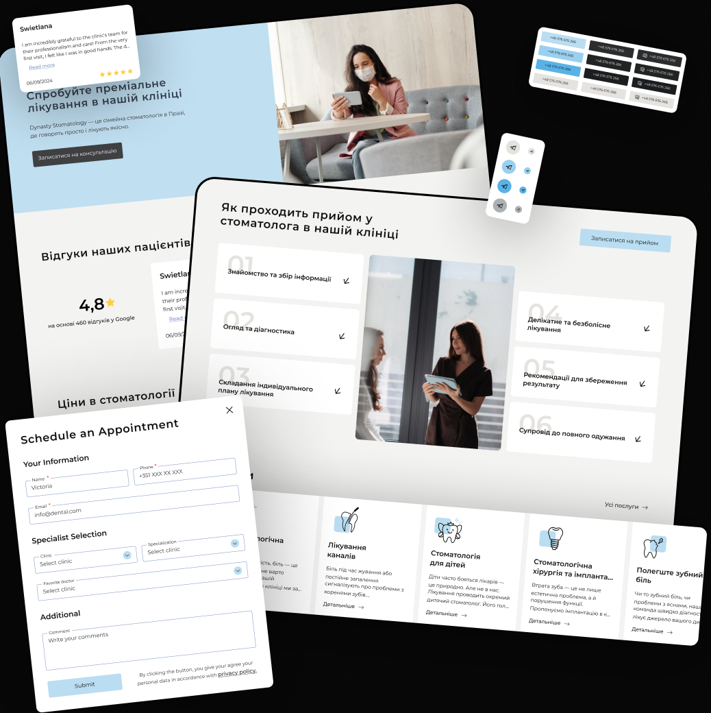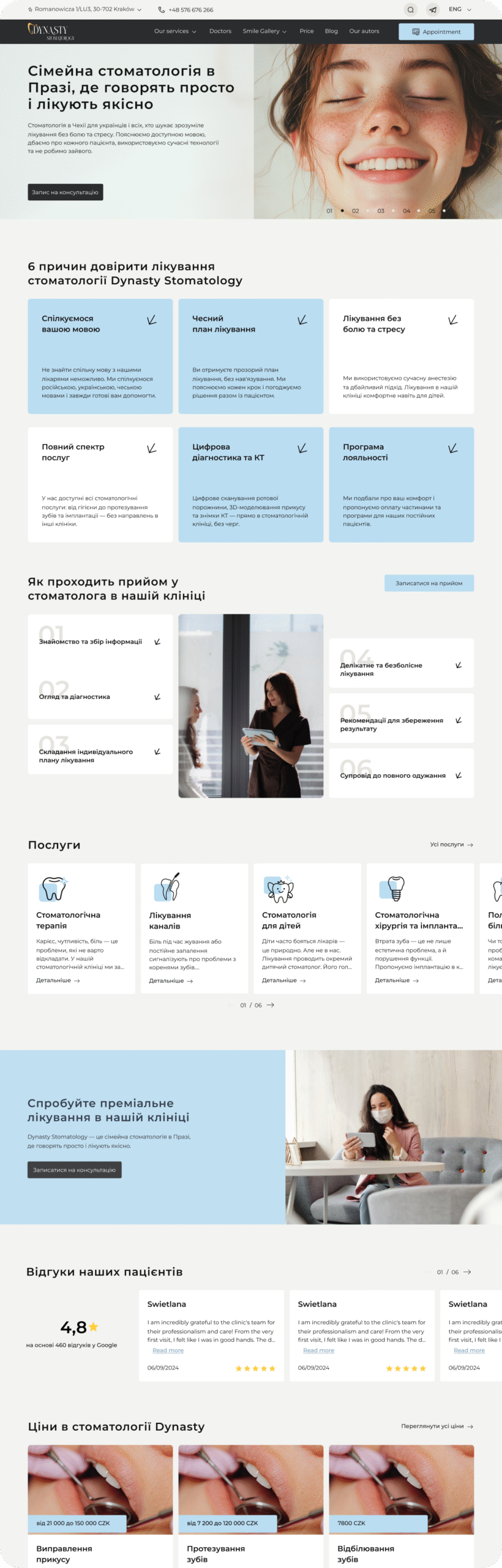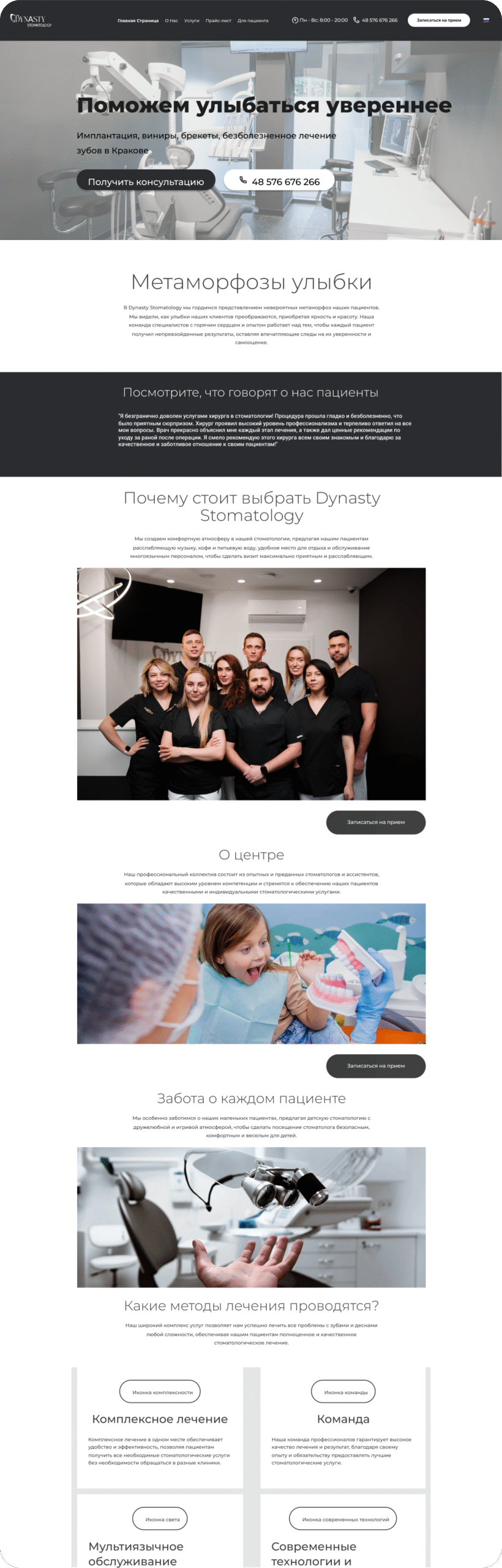 - Сквозные CTA «Записаться», логичная перелинковка.