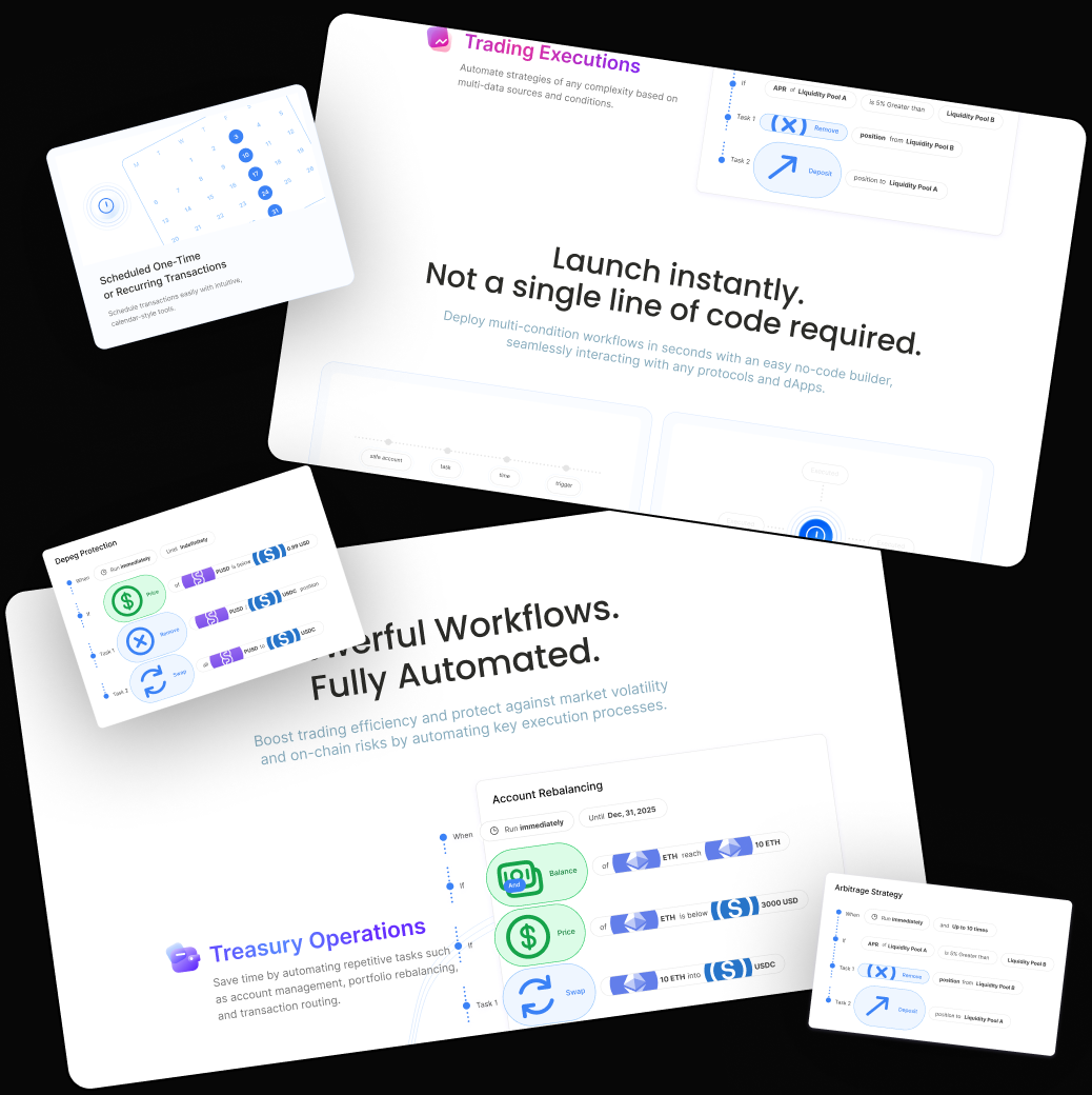 - динамические UI‑скриншоты конструктора (When/If/Task: swap, transfer, remove, deposit),