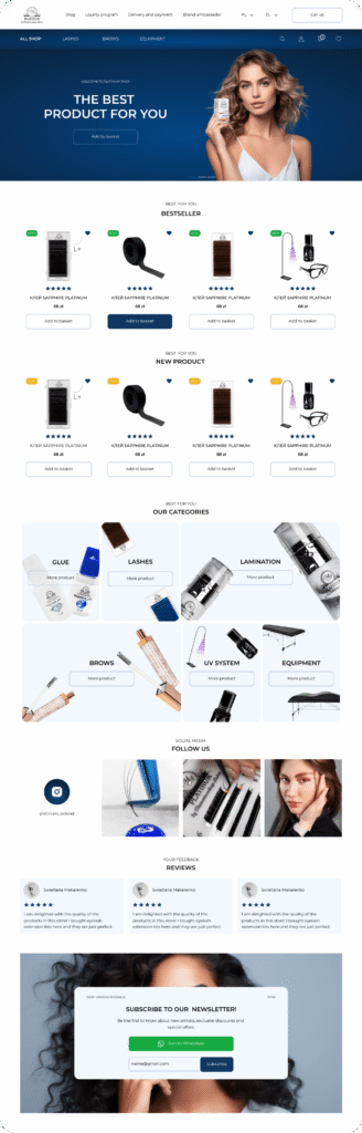 - Современная чистая палитра и сетка, витрины «Bestseller/NEW», соц‑лента, форма подписки;