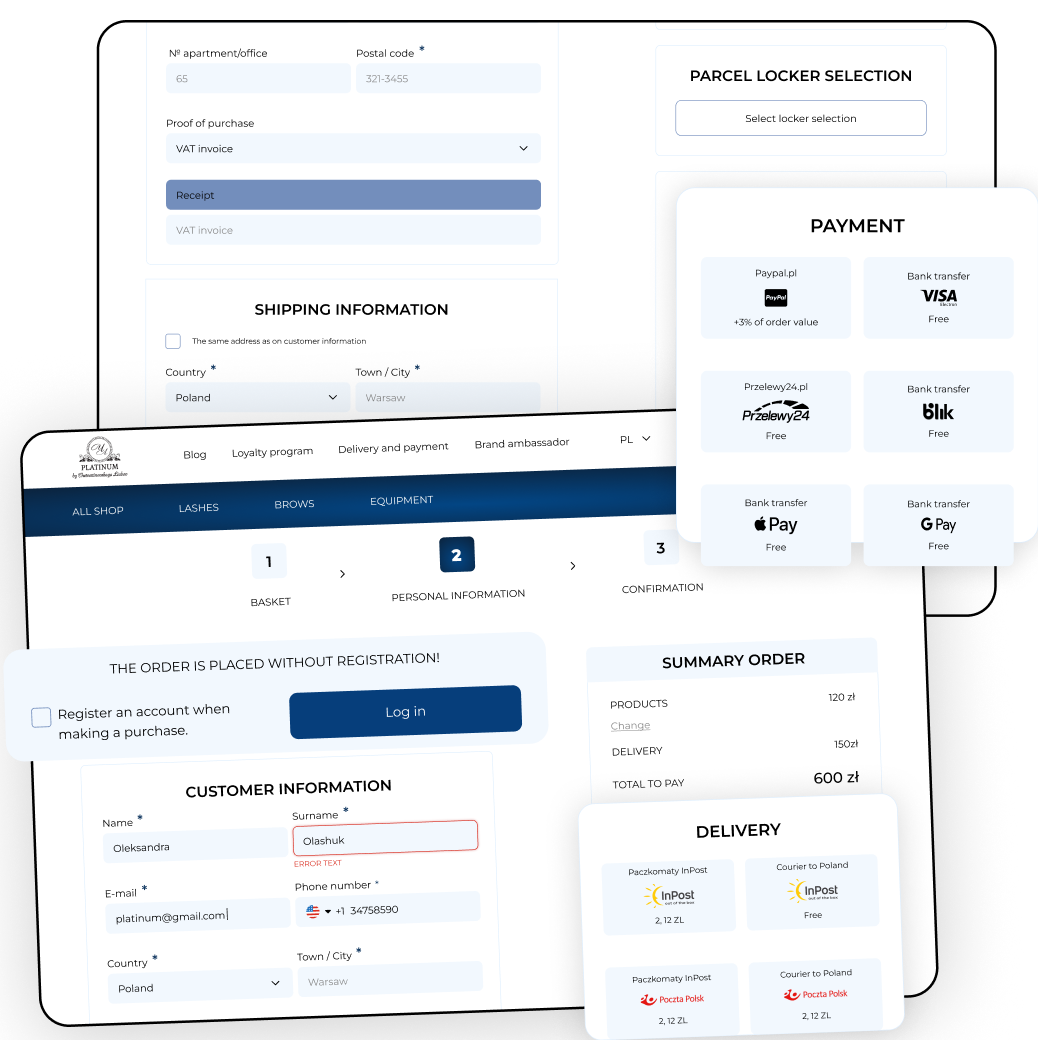 - Подключены оплаты Apple Pay/Google Pay, BLIK, PAYPAL, карты Visa/Mastercard; доставка GLS;